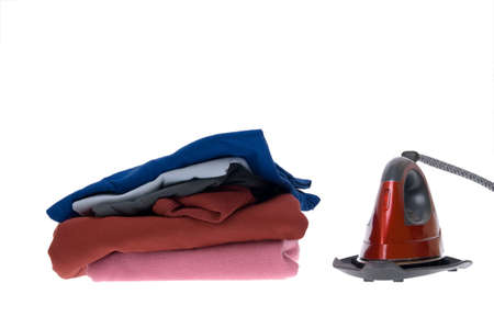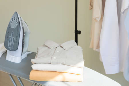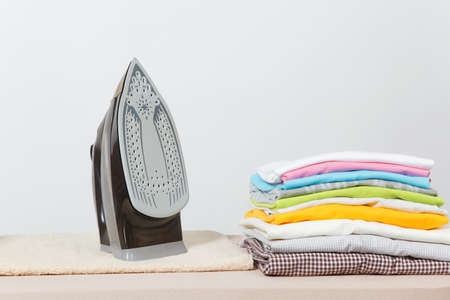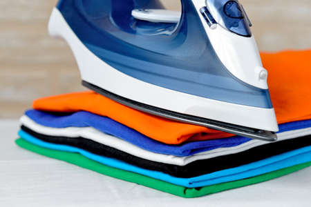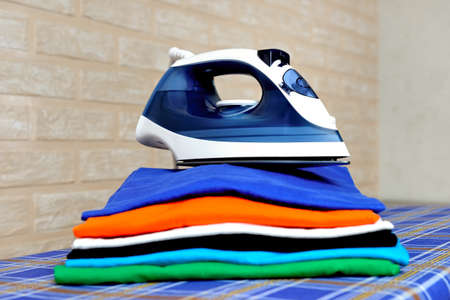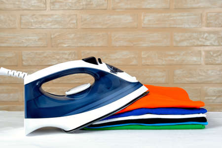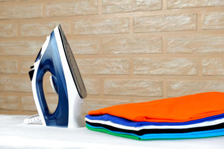New modern electric steam iron and a stack of ironed t-shirts of various colors on ironing board on a brick wall