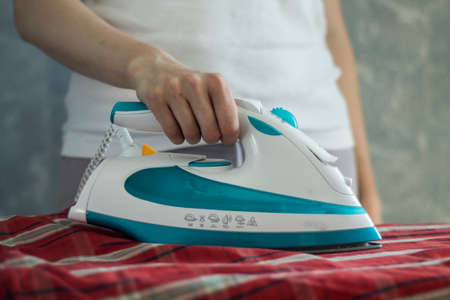 Homework. Close-up, woman ironing clothes with an iron on an ironing board after washing.