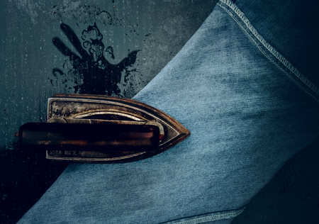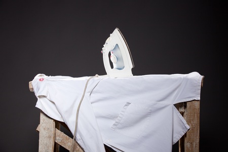 Retro iron ironing a wrinkled white t-shirt on isolated white background with copy space.
