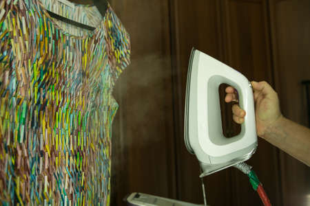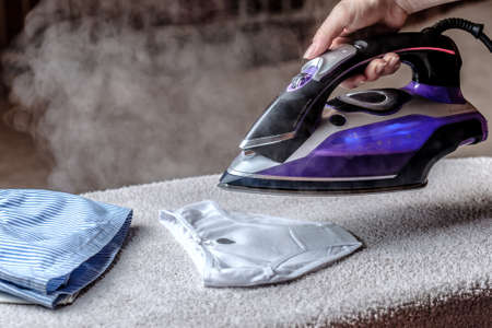Homework. Close-up, woman ironing clothes with an iron on an ironing board after washing. The process of steaming the dress. The steam jet is clearly visible in the photo.