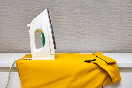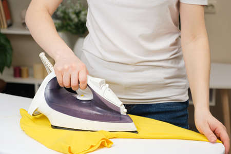 A housewife irons a yellow T-shirt with an iron. Ironing clothes at home, caring for clothes. Hands close-up