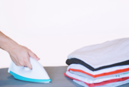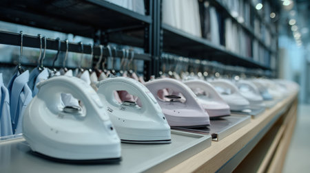 Medium shot capturing a selfservice pressing station where individuals use compact irons to finalize their clothes independently.