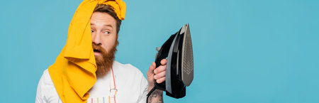 discouraged man with yellow clothing on head holding electric iron isolated on blue, banner
