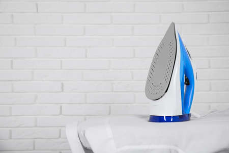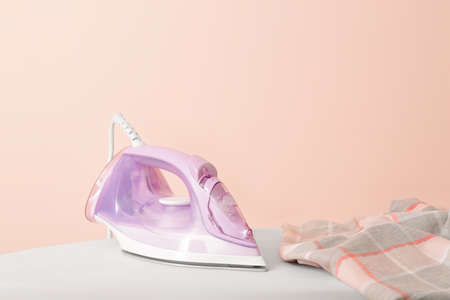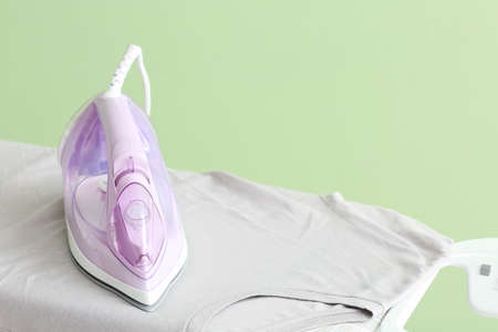 Household laundry ironing. Iron on table on white background, Copy Space.