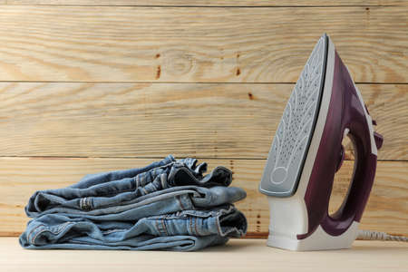 lilac iron and a stack of jeans on a natural wooden background with place for text. ironing clothes. household electrical appliances.