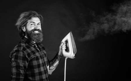 good result. mature brutal hipster use modern technology. household concept. guy ironing diligently. home appliances. happy bearded man holding steaming iron. home domestic duties