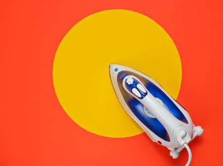 Modern iron for ironing on orange background with yellow circle in the middle. Flat lay fashion still life. Top view