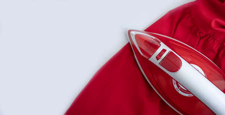 Electric iron and crimson fabric on a wooden background. Minimal concept of linen care.