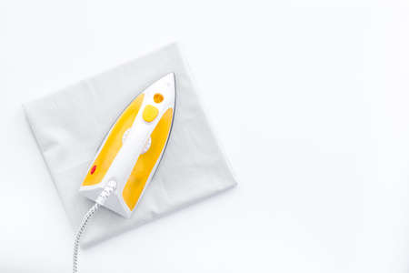 Iron for ironing things on a white isolated background. Laundry concept, tailoring studio, housework. Banner. Flat lay, top view.