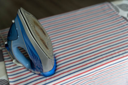 Blue steam iron resting on a striped ironing board, showcasing the appliances design and functionality, ideal for home care and laundry tasks with copy space available