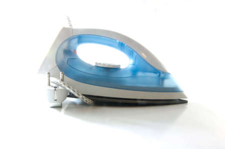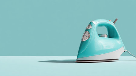A bright blue iron rests on a smooth surface against a pastel background, symbolizing modern household tools for efficient clothing care and organization.