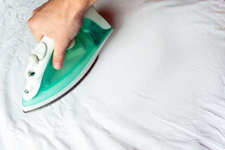 Homework. Close-up, woman ironing clothes with an iron on an ironing board after washing.