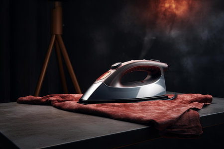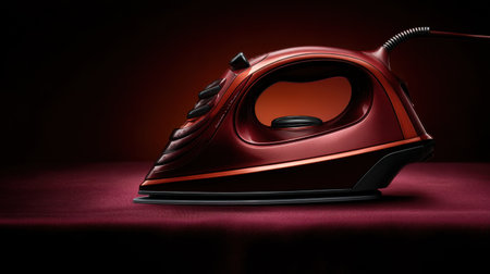 Sleek design steam iron on a red cloth with moody lighting and smoke, showcasing household appliance