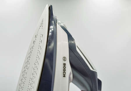 KYIV, UKRAINE - AUGUST 22, 2020: Studio shoot of Bosch Sensixx'x VarioComfort Ceranium Glissee Steam Iron closeup. Robert Bosch GmbH is a German multinational engineering and technology company.