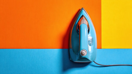 A sleek blue iron rests on a vibrant surface composed of orange and yellow colors against a calming blue background, embodying style and functionality in textile care.