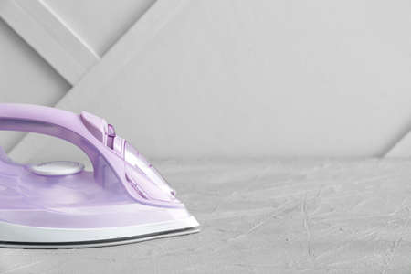 One modern iron on wooden table against light gray background, space for text. home appliances