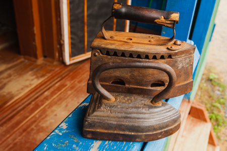 Antique charcoal iron. Vintage iron on wooden blue shelf.Old fashioned ironing tools.Heritage concept.