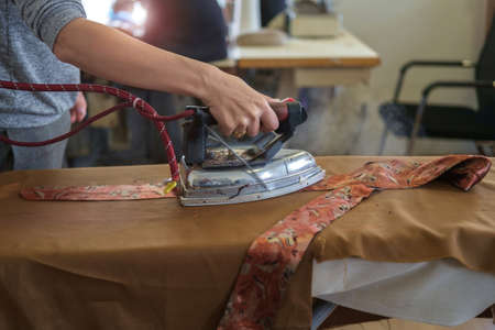 Professional ironing in dry cleaner detail of iron and hands. Presser in sewing clothes pressed
