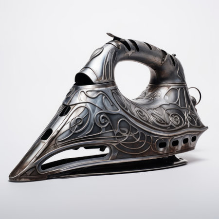 vintage black metal iron with a celtic design, inspired by avant-garde futurism. this unique piece, reminiscent of the works of mat collishaw, dates back to 1000-1400 ce during the kushan empire. the artist, heather theurer, skillfully crafted the distinctive noses using aluminum. ai generated