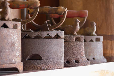 Antique charcoal irons. Vintage irons in row on wooden blue shelf.Old fashioned ironing tools.Heritage concept.