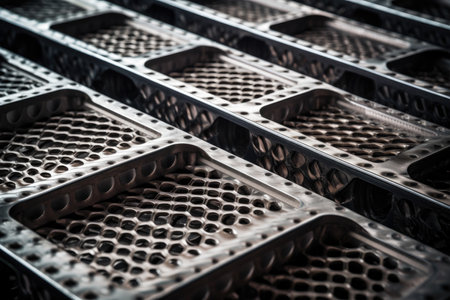 Perforated rusty metal sheet stamping plates texture closeup angled view. Made through metal stamping sheet metal manufacturing lightweight bearing elements structural combine strength functionality.