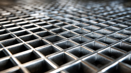 Close up metal grid texture with shadow, industrial steel pattern in black and white tone, abstract background for construction or engineering design concept.