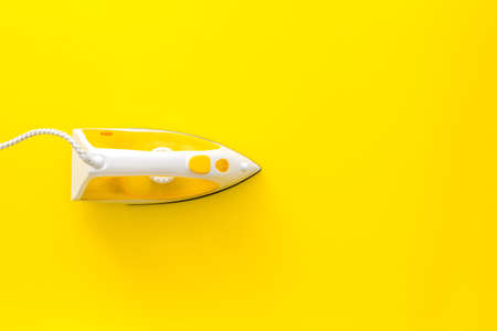 Iron for ironing things on a yellow background. Top view, copy space