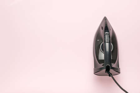 Black electric iron with a wire on a light pink background. Space for text. flat lay.