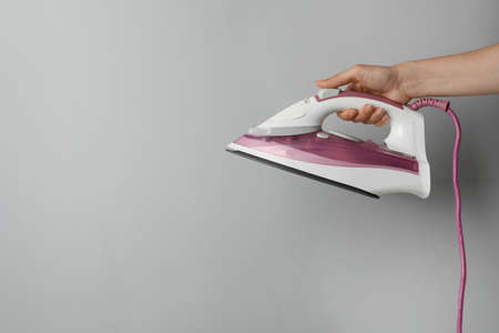 Woman holding modern iron on light gray background, closeup. Space for text