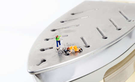 Two miniature female figures cleaning the surface of a dirty burnt iron