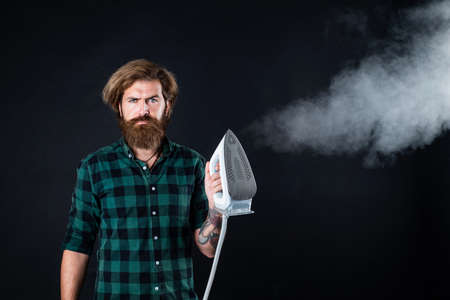 good result. mature brutal hipster use modern technology. household concept. guy ironing diligently. home appliances. happy bearded man holding steaming iron. home domestic duties