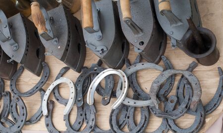 Photo of an old rusty iron that stands on a table on the street in the village.