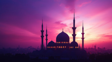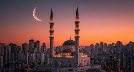 Stunning mosque features tall minarets and a large dome, set against a colorful city skyline at sunset, with a crescent moon enhancing the tranquil ambiance