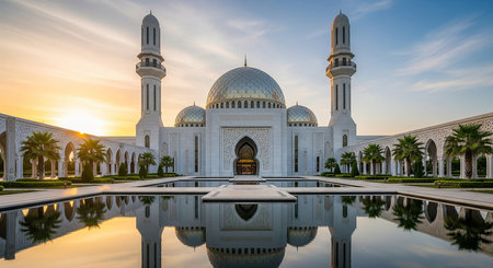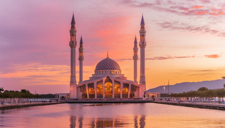 Serene Mosque Reflection at Sunset: A Vision of Peaceful Grandeur