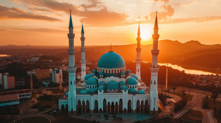 Stunning mosque stands tall against a vibrant sunset, with crescent moon above and cityscape in the background, highlighting architectural elegance and cultural richness