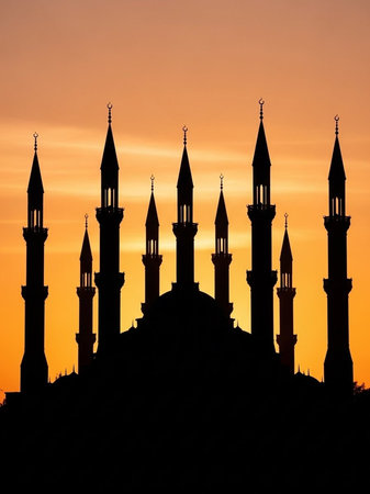 A serene mosque silhouette at sunset with multiple minarets