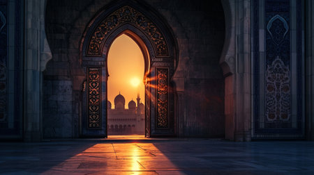 mosque door, sunset light. Beautiful Ramadan Kareem with mosque gate at maghrib