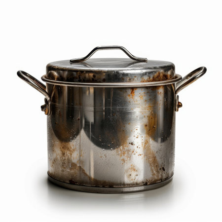 An old stainless steel cooking pot displaying rust and stains, showcasing a vintage aesthetic perfect for culinary photography and kitchenware themes.