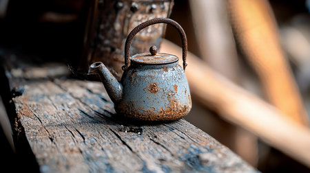 Close-up of a small, distressed blue teapot with rust and cracked paint, sitting on a weathered wooden surface, evoking a sense of age, decay, and rustic charm.