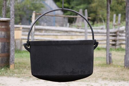 Medieval black cast iron pot on the fireplace.
