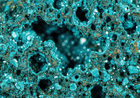 Chrysocolla is a hydrated copper cyclosilicate It has the chemical formula (Cu,Al)2H2Si2O5(OH)4nH2O.Cyan (blue-green) crystal. Macro. Beautiful fantastic background for successful business projects and other Your variant