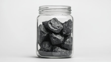 This image features a glass jar filled with natural black stones, creating an elegant and minimalist look, perfect for home d