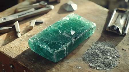 A captivating raw green crystal rests on a wooden workbench, surrounded by various tools and shavings, showcasing the beauty of nature and craftsmanship in a workshop setting.