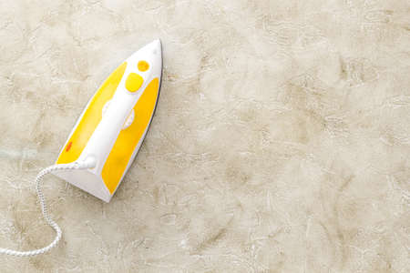 Yellow iron on ironing board. Top view, copy space