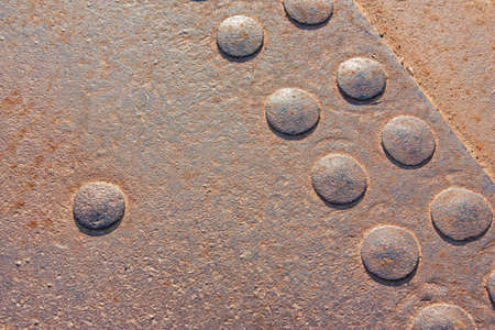 Rusty metal plate with rivets, close-up, background