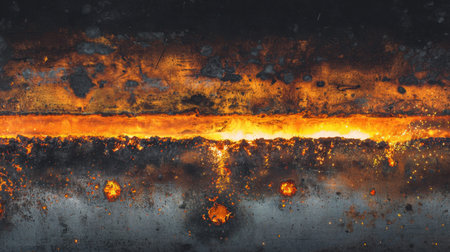 An abstract view of a corroded metal surface showcasing fiery orange hues against deep black tones, illustrating the beauty of industrial decay and erosion in striking detail.