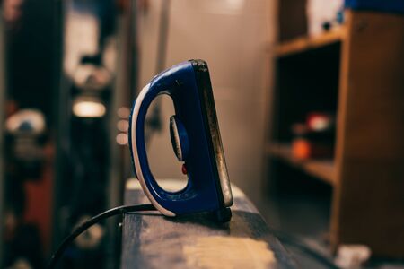 Indoor closeup of an iron. Unidentified home technology branch ironing system object with black plastic. Selective focus on the details, blurred background.