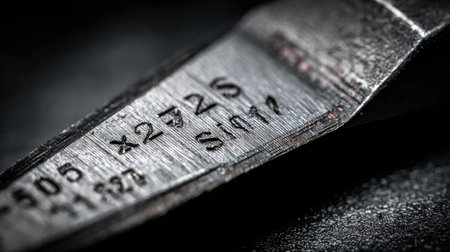 This close-up image showcases a rusty metal tool marked with a serial number, emphasizing the intricate textures and industrial details against a dark backdrop.