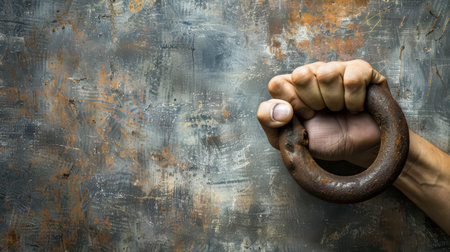 Close Up of a Hand Grasping a Rusty Metal Ring Against a Weathered Background