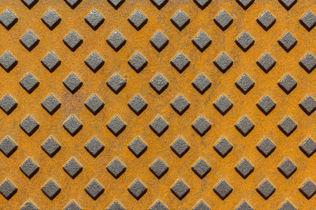 A close-up view of a rusty metal surface, featuring a diamond-shaped pattern, showing the texture and imperfections of aged metal. The surface is covered in rust and dirt.